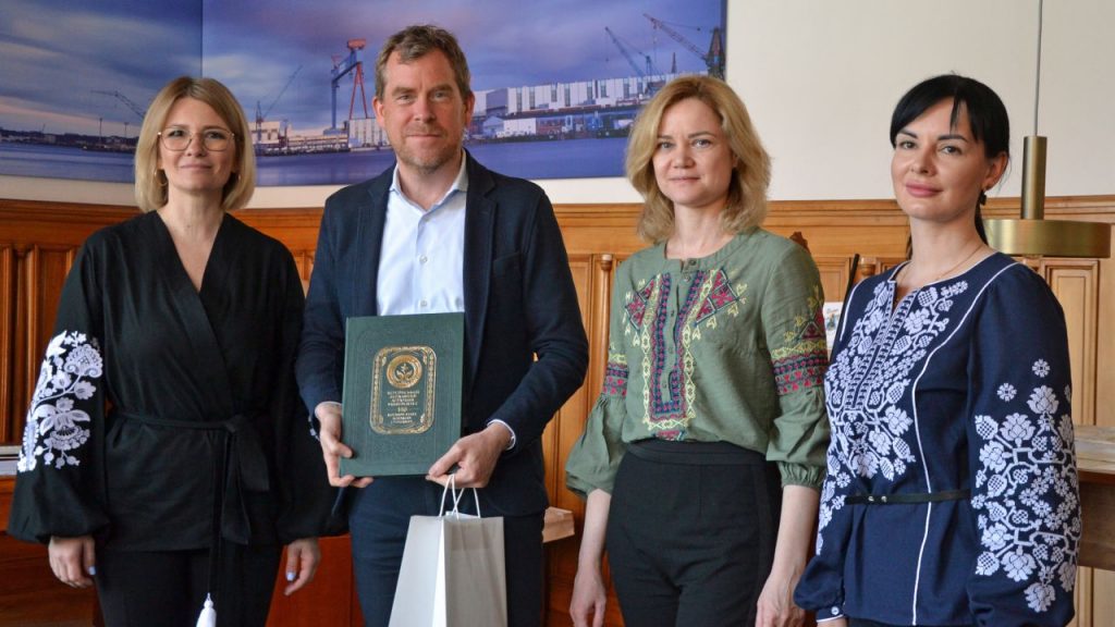 Kiel, 9. May 2023. Today Dr. Ulf Kämpfer, Mayor of the City of Kiel, welcomed a delegation from Kherson State Agrarian and Economic University (KSAEU) including Prof. Dr. Viktoriia Hranovska, Vice-Rector of KSAEU, and Prof. Dr. Viktoriia Krikunova, Dean of the Faculty of Economics. It was also the first time that the whole project team met in person. The delegation expressed their gratitude for the ongoing German help and strongly supported the idea of a city partnership between Kherson and Kiel. Prof. Hranovska introduced to the City and Oblast of Kherson and presented Kherson State Agrarian and Economic University. She also informed Dr. Kämpfer about the difficult situation in the City of Kherson which still suffers from constant shelling by Russian troops.