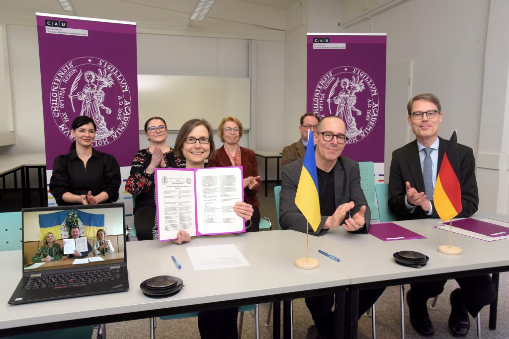 “We continue to stand by the Ukrainian people. That is why I am extremely pleased that we can support research and teaching at KSAEU. The universities in Kiel and Kherson also benefit from the professional exchange with each other. I thank you all for your great commitment and look forward to the further, now also institutionally enshrined cooperation,” said Kiel University’s President Prof. Dr. Simone Fulda. (Photo: © Jürgen Haacks, Uni Kiel)