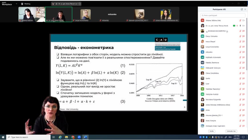 As part of the ongoing academic cooperation between Kherson State Agrarian and Economic University and Kiel University, a guest lecture by Dr. sc. pol. Anna Titova, Interdisciplinary Center for Statistics at Kiel University, took place on April 8, 2025.